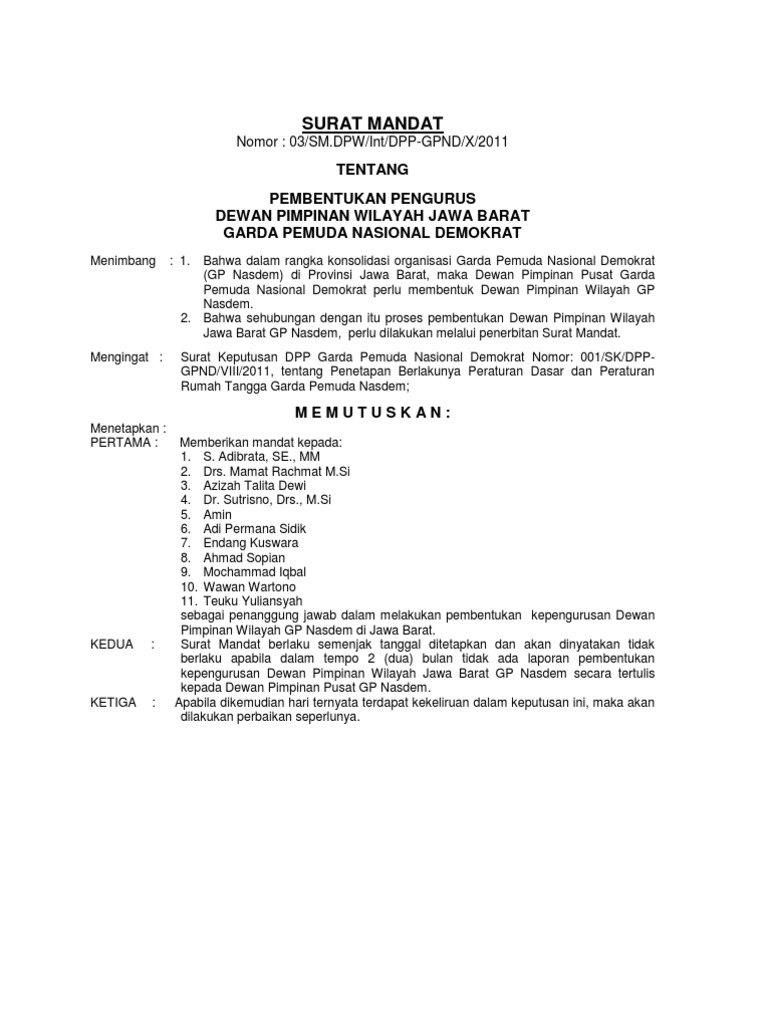 Text of contoh surat mandat. Download contoh surat mandat ipnu. Wallahul muwafiq ilaa aqwamith thooriq. If the download doesn't start, click here. Demikian surat mandat ini dibuat untuk dapat diguna.